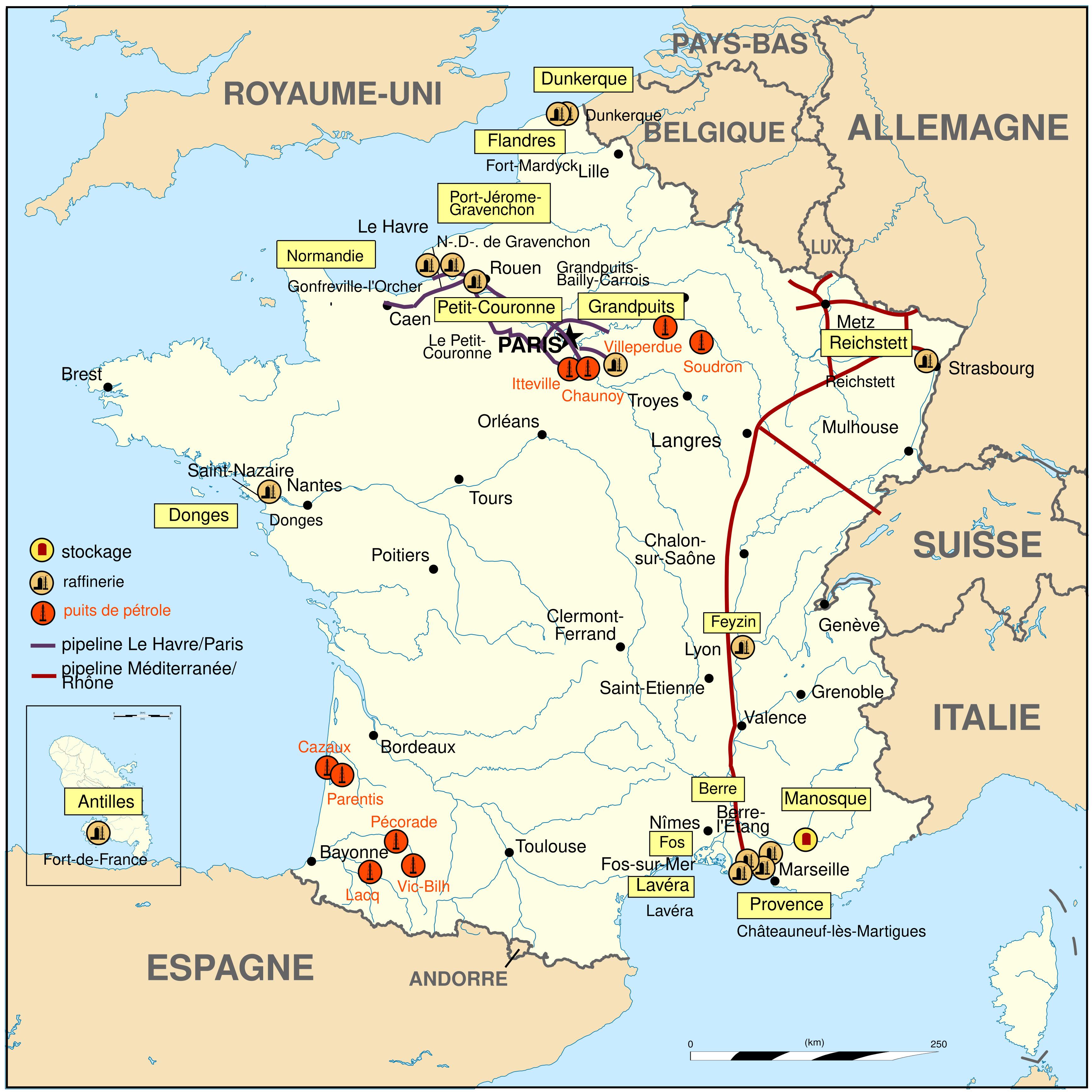 Map of France petrol. France petrol map (Western Europe - Europe) to print. France petrol map (Western Europe - Europe) to download. Les réserves de pétrole en France sont principalement réparties entre le Bassin parisien et le Bassin aquitain. Entre 1956 et 2017, le Gouvernement français a reçu plus de 1 700 demandes de titres d'exploration (demandes de permis exclusifs de recherches d'hydrocarbures liquides ou gazeux) et en a octroyé plus de 600. Ceux-ci ont conduit à l'octroi de 77 titres d'exploitation (concessions d'hydrocarbures liquides ou gazeux), principalement dans le Bassin parisien, le Bassin d'Aquitaine et le fossé Rhénan, Au cours de cette période, la France a produit environ 100 millions de tonnes de pétrole et 300 milliards de m3 de gaz naturel (245 Gm3 pour le seul gisement de Lacq, 56 Gm3 pour Meillon) as its shown in France petrol map. Environ 4 000 puits d’exploration et de production ont été forés.