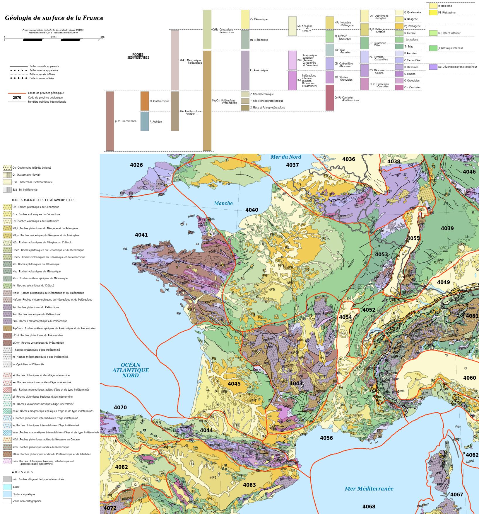 Map of France geological. Geological map of France (Western Europe - Europe) to print. Geological map of France (Western Europe - Europe) to download. The regional geology of France as its shown in the geological map of France is commonly divided into the Paris Basin, the Armorican Massif, the Massif Central, the Aquitaine Basin, the Pyrenees, the Alps, the Côte languedocienne, the Sillon rhodanien, the Massif des Vosges, the Massif Ardennais, the Alsace graben (Rhine graben) and Flanders Basin.
