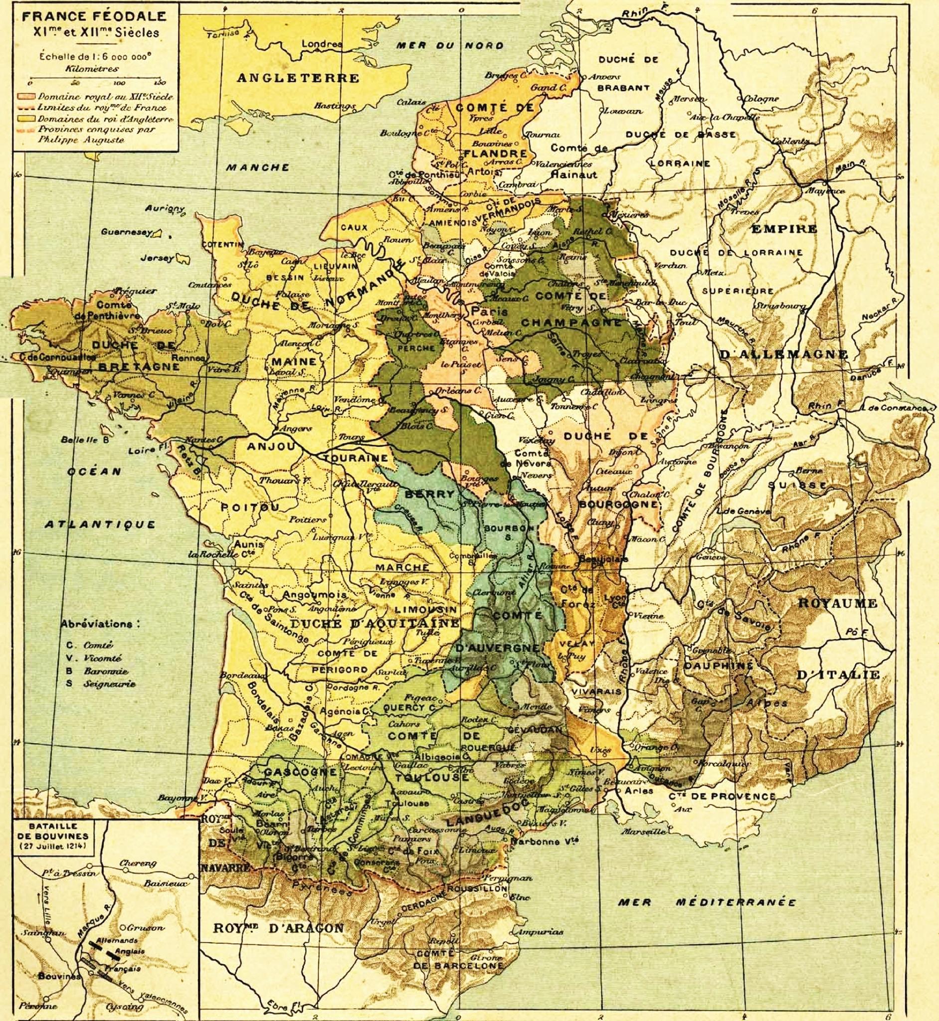 The appearance of royal suzerainty, which essentially marked the reign of Louis VII, allowed his son Philippe Auguste (1180-1223) to increase his estate tenfold: inheritance of Picardy, or, more exactly, of several Picardy counties and châtellenies (Treaty of Boves, 1185) and, above all, annexation of the possessions of the Plantagenets from 1203 to 1205 (→ Normandy, Maine, Anjou, Touraine, Poitou, etc.) as you can see in the medieval France map.