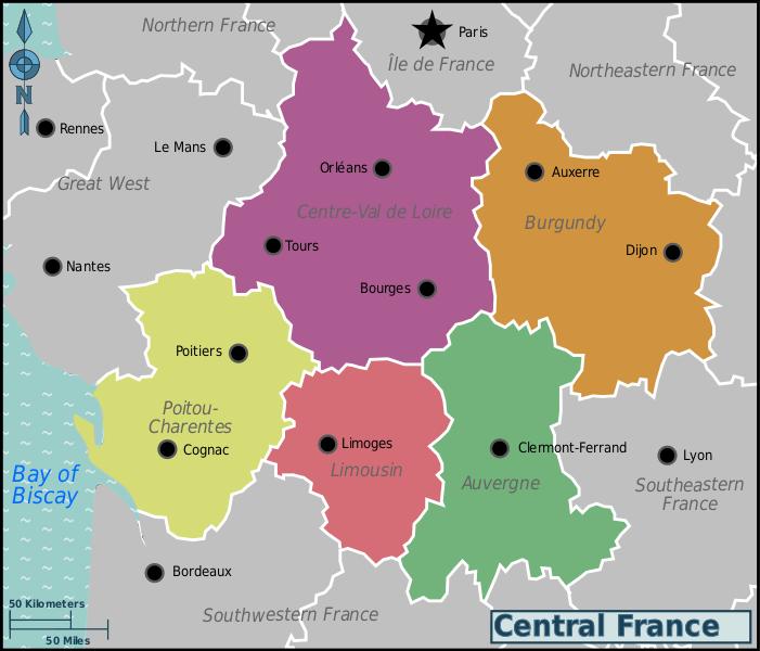 Map of France central. Map of central France (Western Europe - Europe) to print. Map of central France (Western Europe - Europe) to download. Central France may not boast fine beaches or share its borders with other European nations, but some of the country richest landscapes and attractions are located here: the châteaux of the Loire Valley, the extensive vineyards of Burgundy, the lakes and moors of Limousin and the volcanoes of the Auvergne as its shown in the map of central France. It also holds the shining jewel in France crown – Paris. A visit to central France is a chance to discover some of its less frequented areas, to delve further into its magnificent history and culture, and to sample some of its greatest produce.